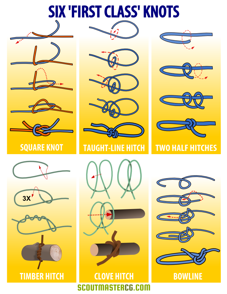 Here's a handy one-page reference that shows six First Class Knots ââ¬â the square knot, taught-line hitch, two half hitches, timber hitch, clove hitch and bowline. Here's more knot infographics Six First Class Knots and over 40 more ... [more]