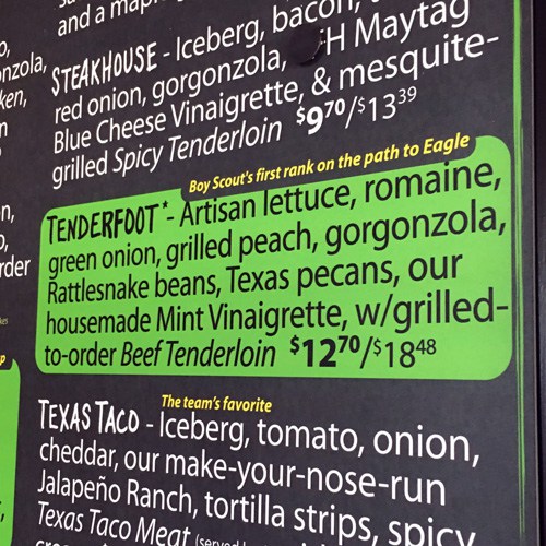Most patrols don't think "gourmet salad" when planning their campout menu. But with a recipe like this one I tried last week, that might change. A Dallas-based salad chain now has a Scouting-themed salad called the Tenderfoot. Snappy... [more]