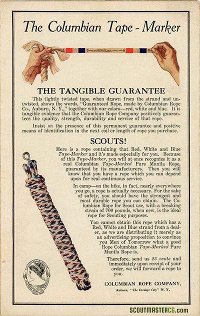 In 1925 the Columbian Rope Company published a brochure with images of impressive displays of Scouting knots to advertise their tape marked pure manilla rope. Two images feature a large knot board made by Troop 4 of Columbus Ohio. I wonder if that... [more]
